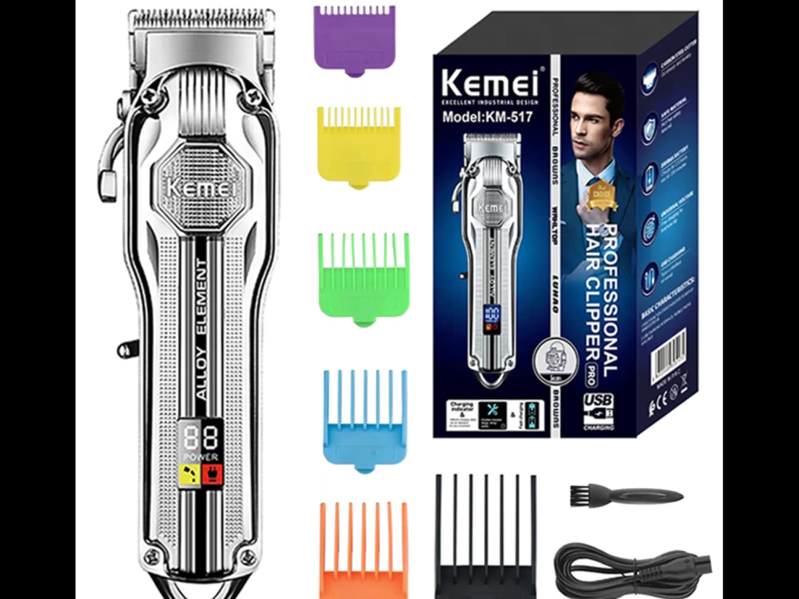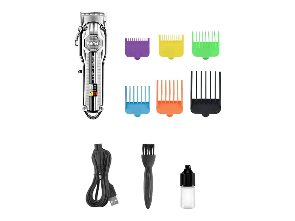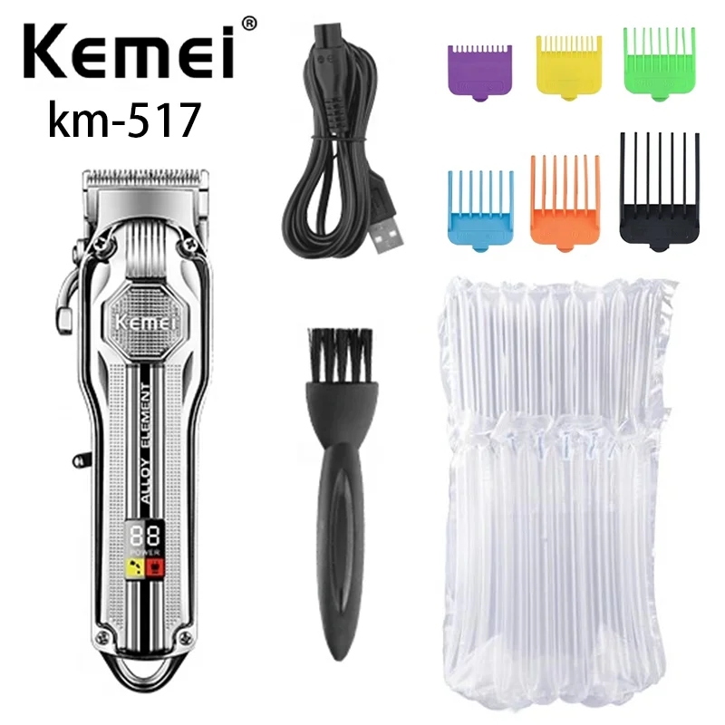 La Kemei KM‑517 es una cortadora inalámbrica digital de alto rendimiento, ideal para uso casero y profesional, con batería de larga duración, pantalla LCD y accesorios completos para múltiples estilos.