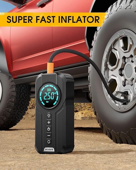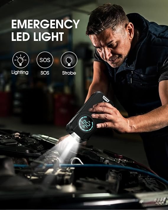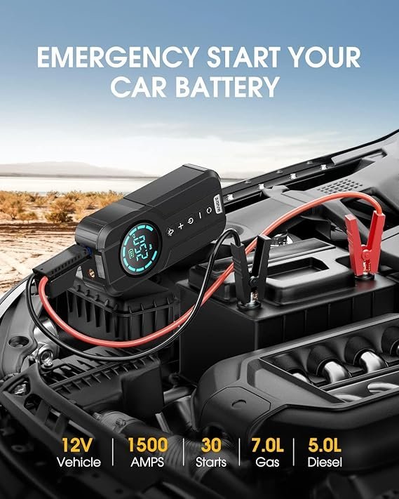 Incluye un compresor de aire digital integrado de 150 PSI, perfecto para inflar neumáticos de automóviles, motocicletas, bicicletas e incluso pelotas deportivas, con pantalla LCD para un inflado preciso y seguro. Su diseño compacto y portátil permite guardarlo fácilmente en la guantera o el maletero, siempre listo para emergencias.