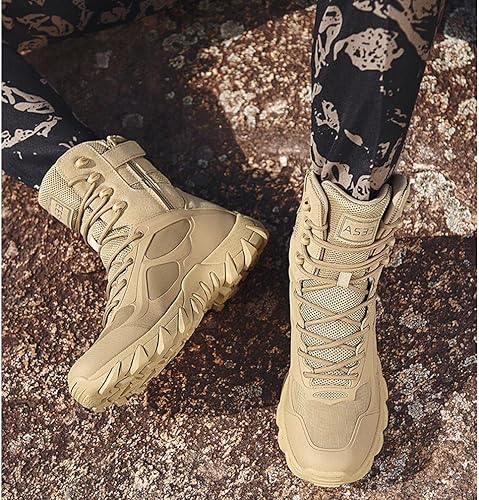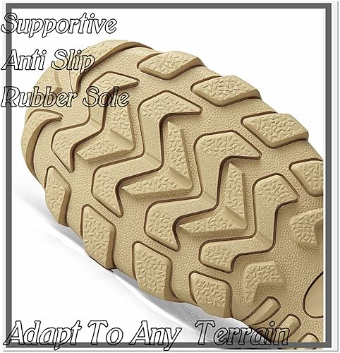 - Suela todo terreno, gran agarre con diseño de patrón geométrico, botas de trabajo antideslizantes para hombres. La puntera y el talón reforzados proporcionan una protección completa, anticolisión y soporte para el tobillo. Adecuado para botas tácticas, militares, de combate, caza, motocicleta, airsoft.