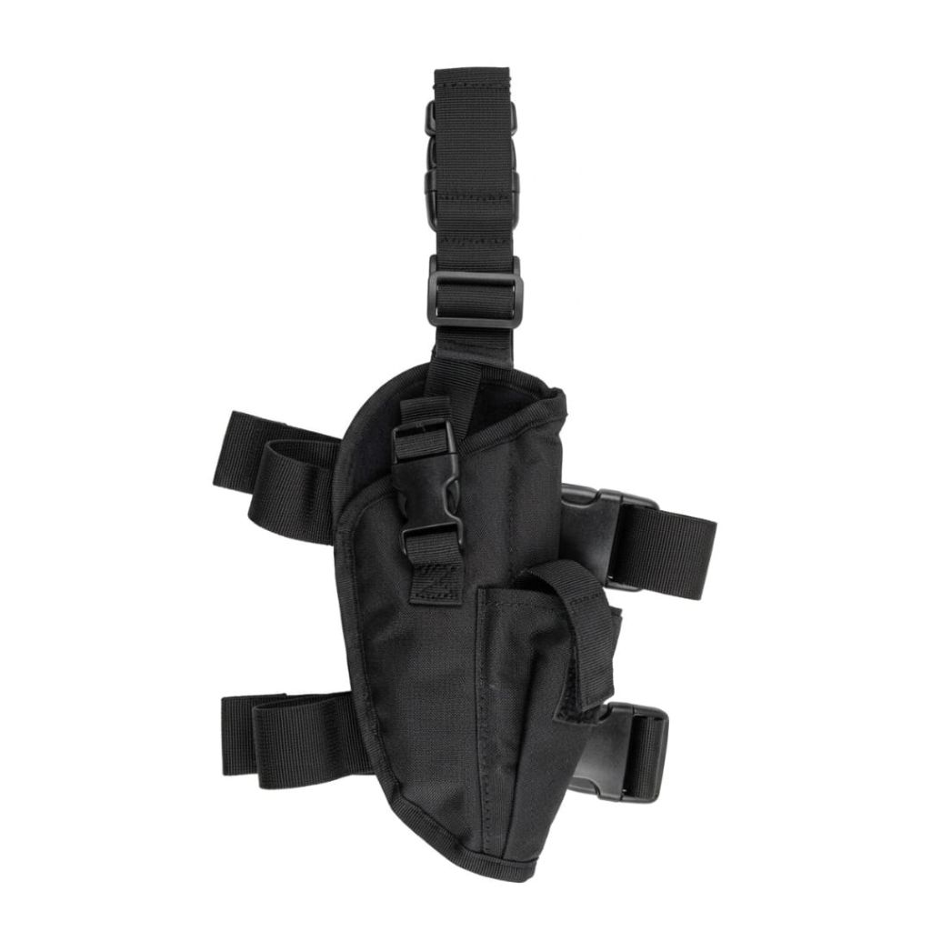 Cuenta con múltiples correas de seguridad con broches de liberación rápida que permiten colocarla y retirarla fácilmente. Además, su diseño universal permite adaptarse a distintos modelos de pistolas, proporcionando una sujeción firme y confiable.