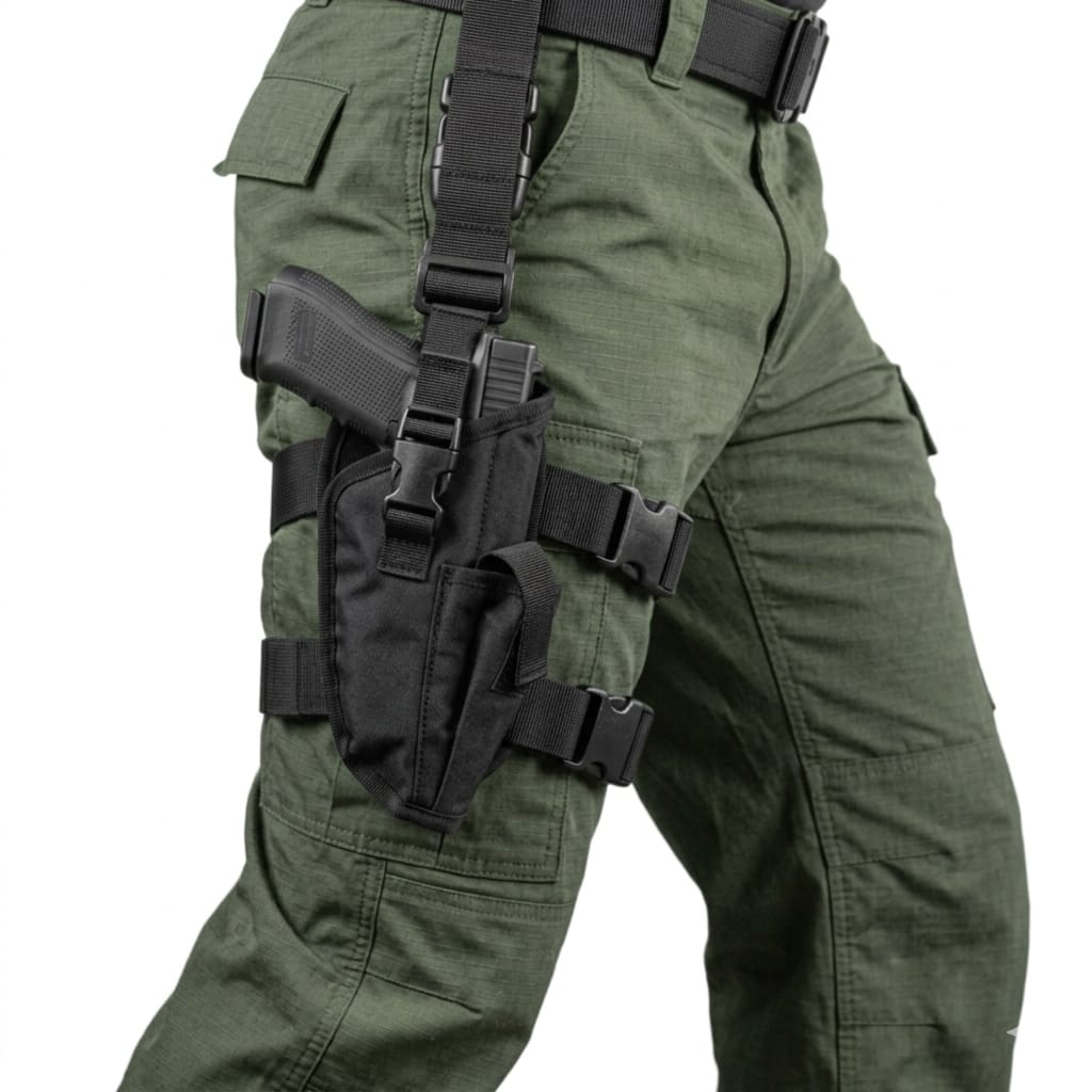 Holster táctico de muslo diseñado para ofrecer acceso rápido, ajuste seguro y máxima comodidad. Ideal para actividades tácticas, airsoft, entrenamiento o uso profesional.