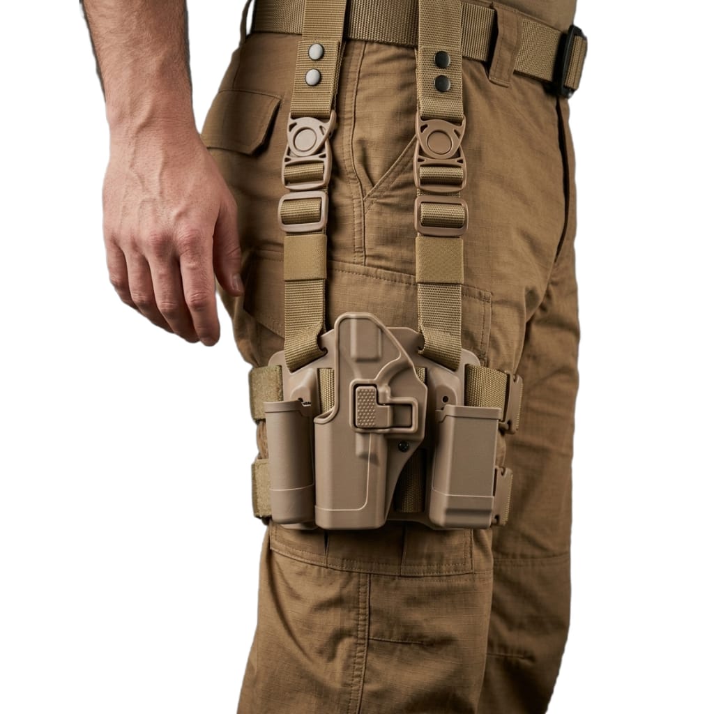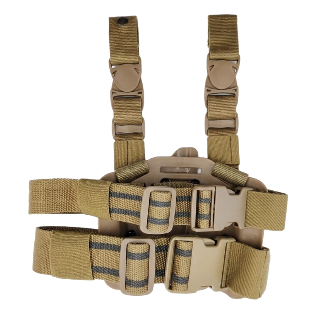 El holster táctico de muslo con sistema de retención está diseñado para proporcionar seguridad, rapidez de acceso y máxima estabilidad durante su uso. Su estructura rígida ofrece una excelente protección y su mecanismo de liberación permite extraer el arma de forma rápida y controlada.