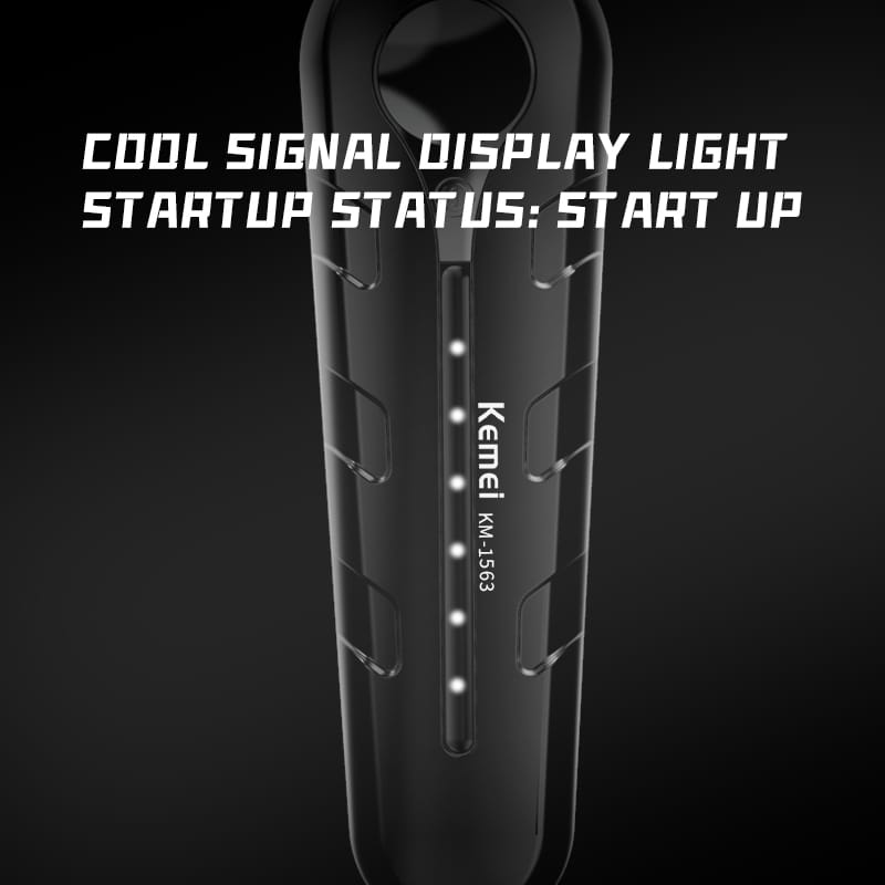 La Kemei KM-1563 es una cortadora profesional que combina potencia, autonomía y precisión. Su motor de 7200 RPM permite cortar cabello grueso y barba con facilidad, mientras que su batería de 1200 mAh ofrece cerca de 3 horas de uso continuo tras unas 2 horas de carga.