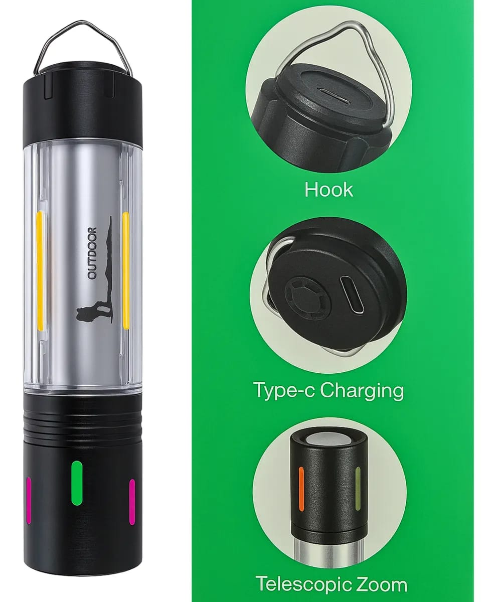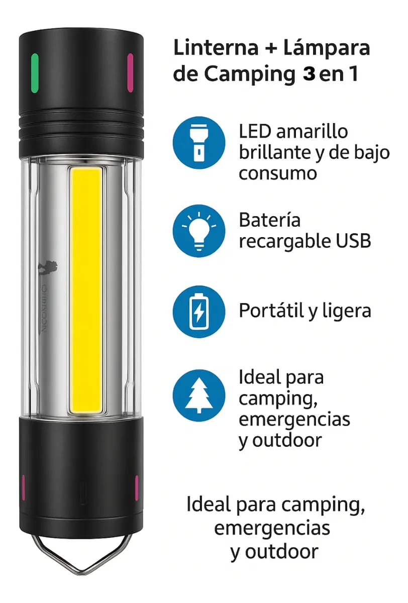 Incluye batería recargable y sistema de carga USB, lo que garantiza comodidad y ahorro. Su gancho superior integrado permite colgarla fácilmente en carpas, mochilas o interiores, convirtiéndola en una herramienta indispensable para el hogar y la aventura.