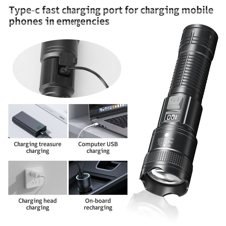 El puerto USB-C permite múltiples métodos de carga: enchufe de pared, ordenador, batería externa o cargador de coche, lo que la hace extremadamente versátil. Además, su diseño ergonómico antideslizante y resistente al uso rudo la convierte en una linterna confiable tanto para uso doméstico como profesional.