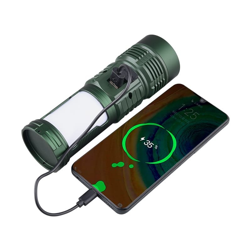 - Batería y Carga: Es recargable mediante USB Tipo-C y utiliza generalmente una batería 18650. También puede funcionar como power bank para cargar dispositivos móviles en emergencias.