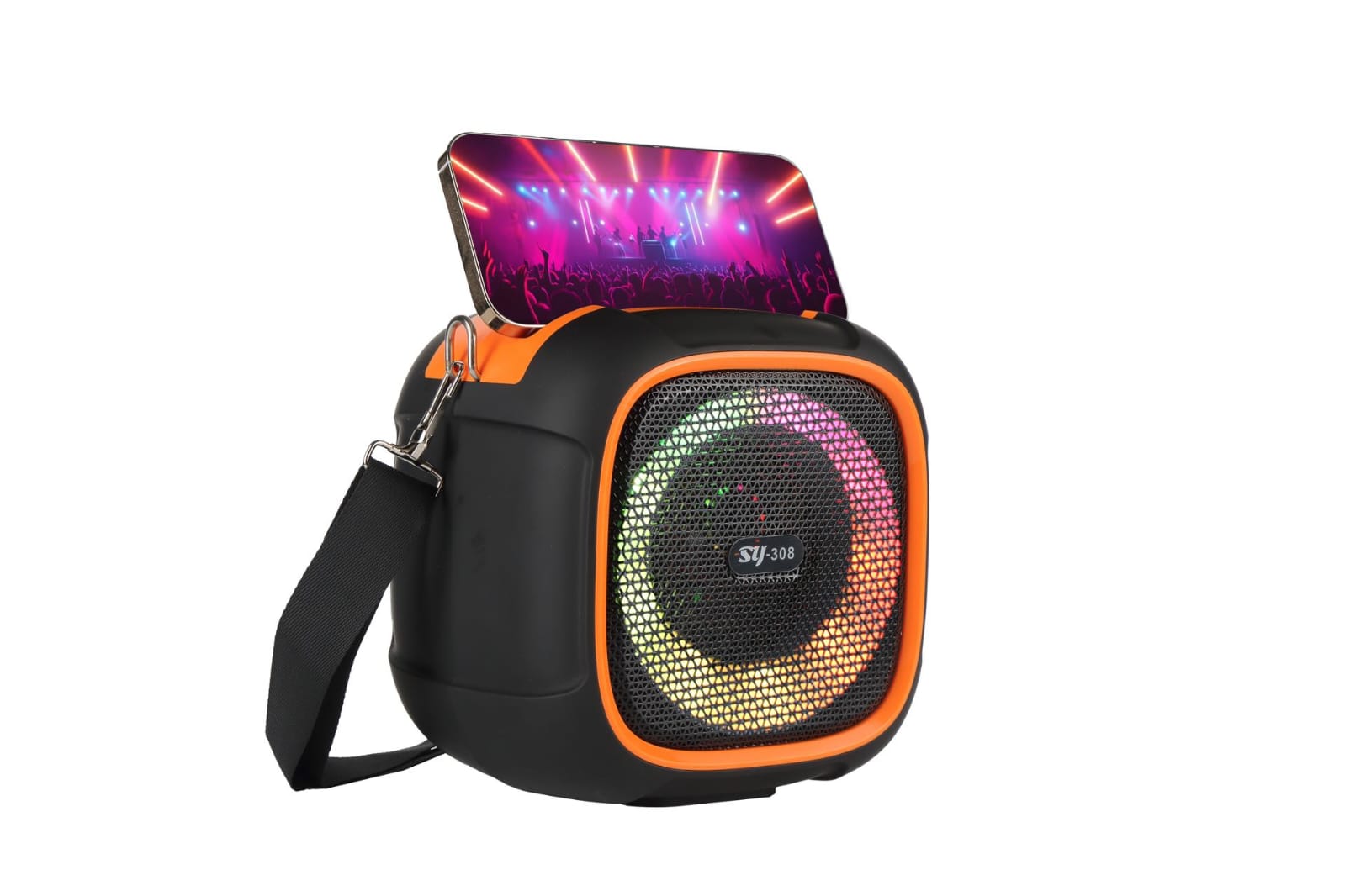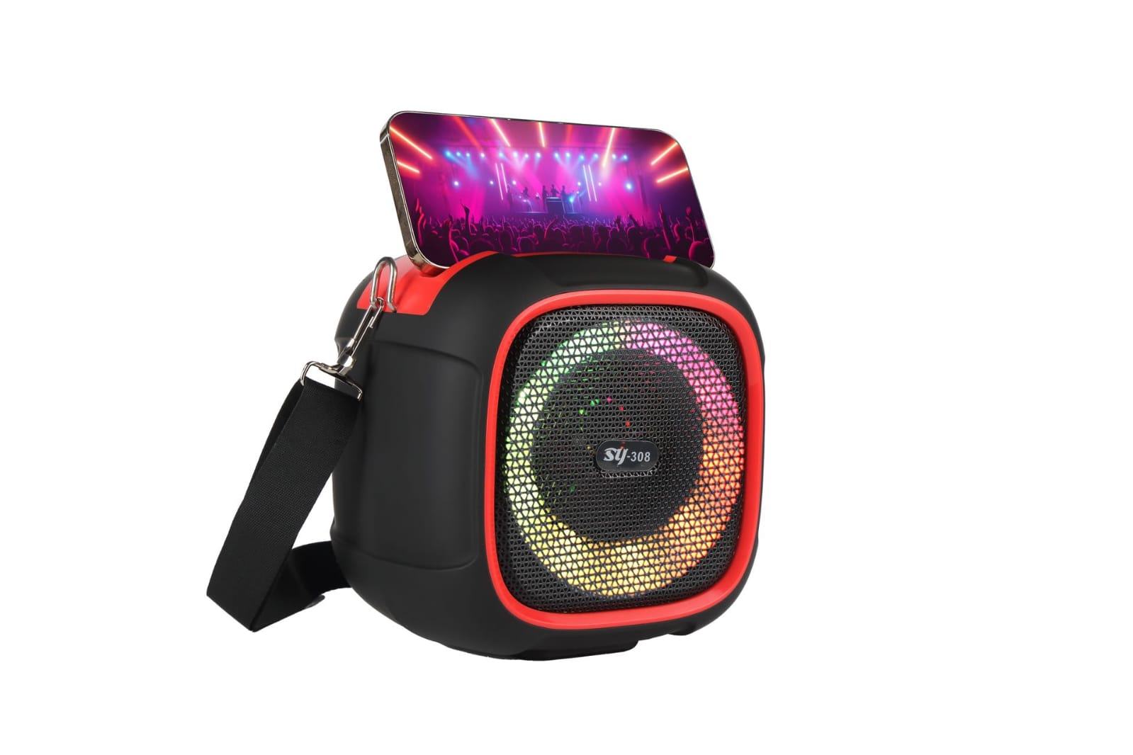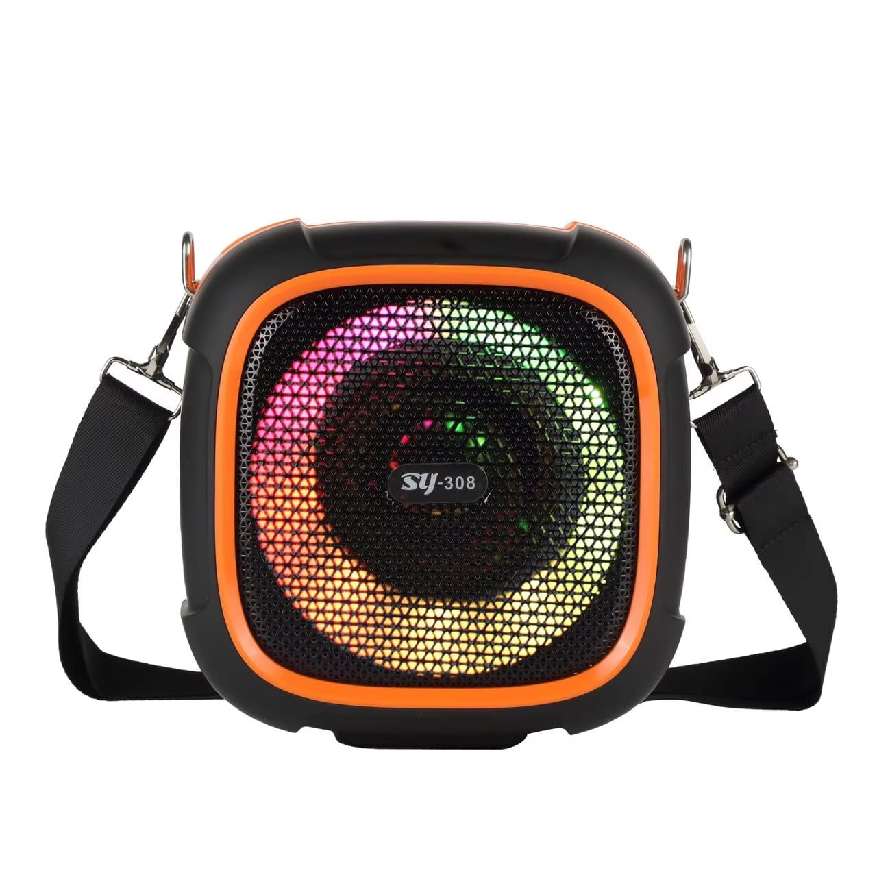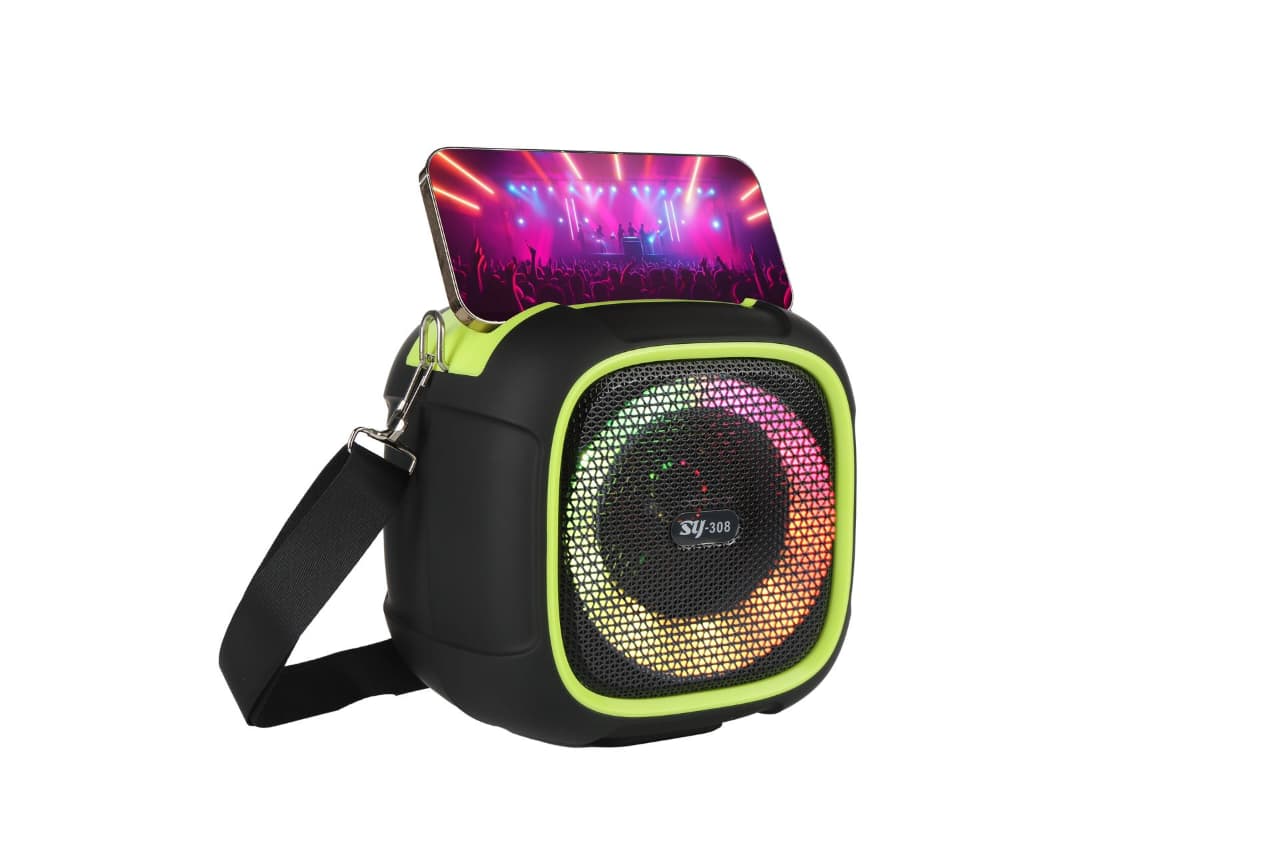 El parlante inalámbrico SY-308 es la opción perfecta para llevar tu música a cualquier lugar con un sonido potente y bajos profundos. Diseñado con un estilo moderno y luces LED RGB que cambian al ritmo de la música, crea un ambiente ideal para fiestas, reuniones o uso diario.