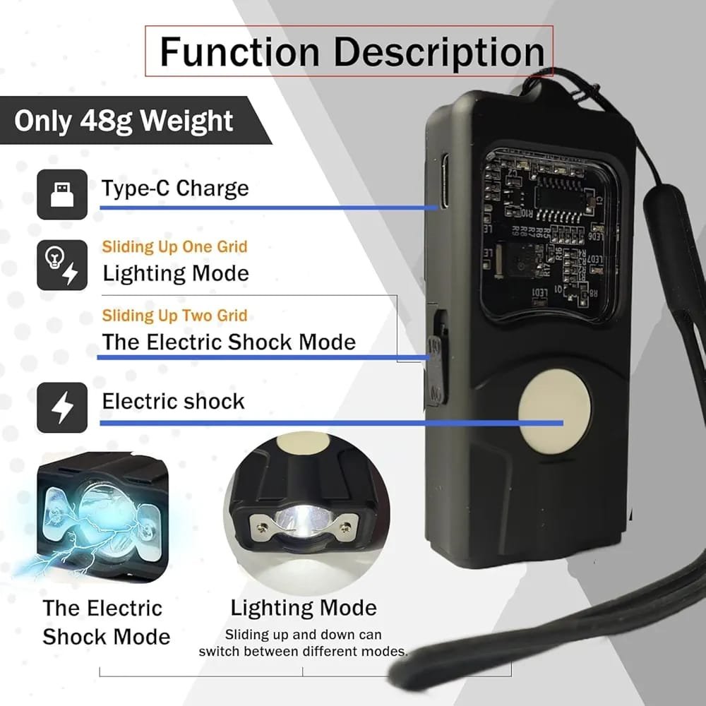Este dispositivo cuenta con una potente descarga eléctrica, diseñada para inmovilizar a un agresor en segundos, dándote tiempo de escapar y ponerte a salvo. Además, su linterna LED integrada no solo sirve para iluminar en zonas oscuras, sino que también puede desorientar visualmente a la persona que intenta atacarte, aumentando tu nivel de protección.